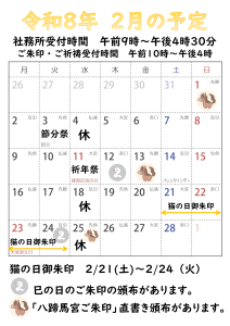 水曜日は、休務日のため、ご祈祷や授与品の頒布、御朱印の直書きでの頒布はお休みさせていただきます。
