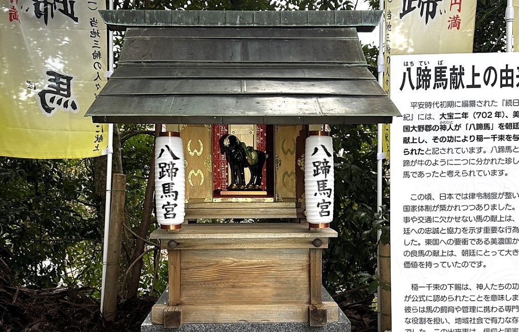八蹄馬宮は、今から約1300年前の大宝2年(702年)、揖斐川周辺に住んでいた神人が、蹄が分かれた珍しい良馬「八蹄馬」を朝廷に献上し、その功により稲一千束を賜ったという史実にちなみお建てされたお社です。