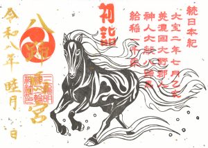 八蹄馬宮御朱印 令和7年12月28日 授与方法:書き置き(A5サイズ 高さ148mm幅210mm) *午の日(1月は8日と20日)は、直書きでもお授けいたします。 頒布開始日:令和8年1月1日 八蹄馬宮は、約300年前にこの地で神人(みわひと)たちが「八蹄馬」という珍しい良馬を朝廷に献上し、その働きが認められたという史実にちなんだお社です。 本御朱印は、八蹄馬宮をお詣りされた記念として、三輪の地の由緒に思いをはせ、日々の暮らしが穏やかに整い、良き方向へと導かれるよう願いを込めてお授けしております。 Tweet Share 令和8年1月の予定 前の記事 令和8年1月の御朱印 次の記事